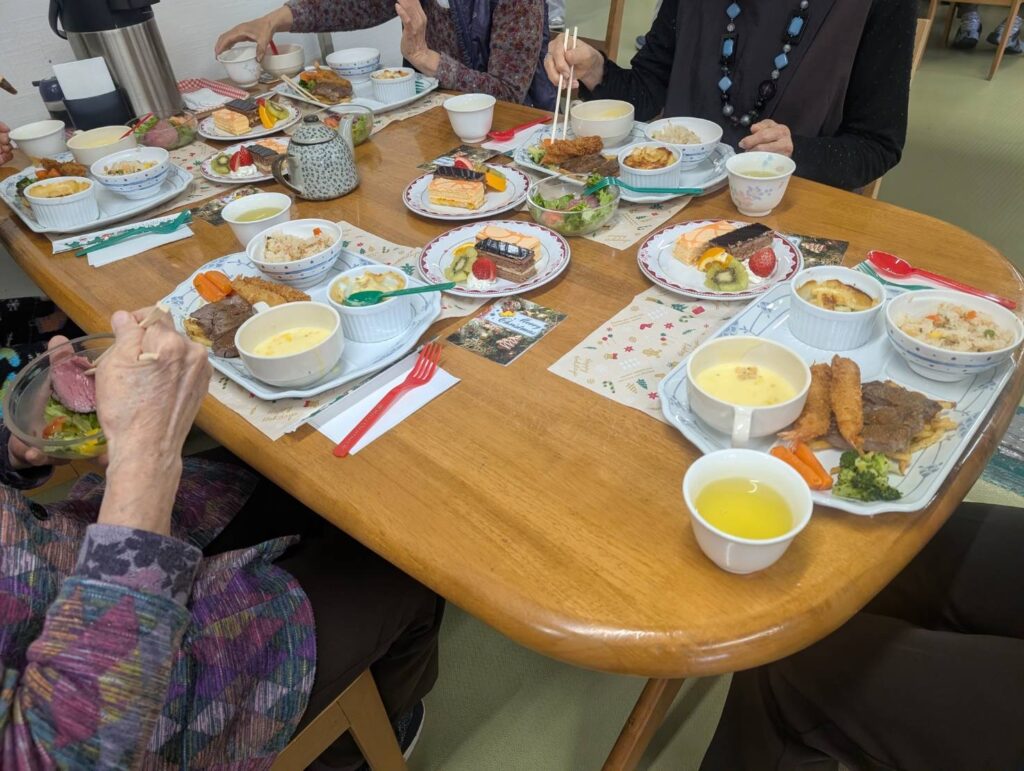 この日のメニューは、ステーキ、フライドポテト、エビフライ、グラタン、ローストビーフのサラダ、コーンスープ、海鮮ピラフ、ケーキと、華やかな内容となりました。彩り豊かなお食事に、皆さまにも季節の雰囲気を感じながら楽しんでいただけたようです。